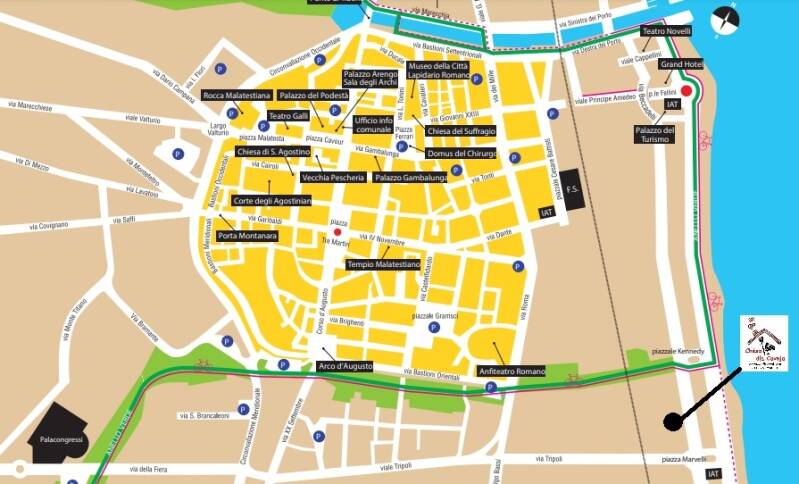 Superata la piazza in direzione mare, in Via Gambalunga, spicca il Palazzo costruito nel 1610 da Alessandro Gambalunga e donato tramite lascito testamentario insieme alla sua straordinaria Biblioteca, una delle più antiche e importanti d’Italia, al Comune.