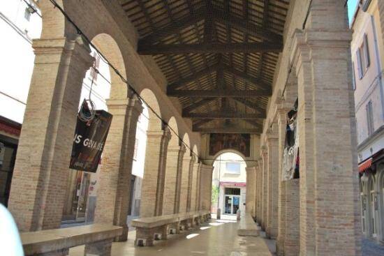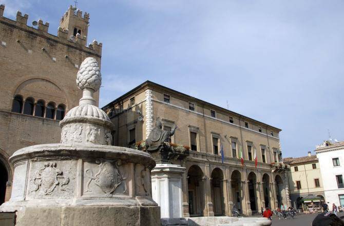 La facciata del Teatro Amintore Galli che guarda la piazza è ciò che rimane, invece, della bellissima struttura progettata da Luigi Poletti e realizzata tra il 1843 e il 1856. Inaugurato l’anno successivo con “l’Aroldo” di Giuseppe Verdi, il teatro andò distrutto con la grande guerra.